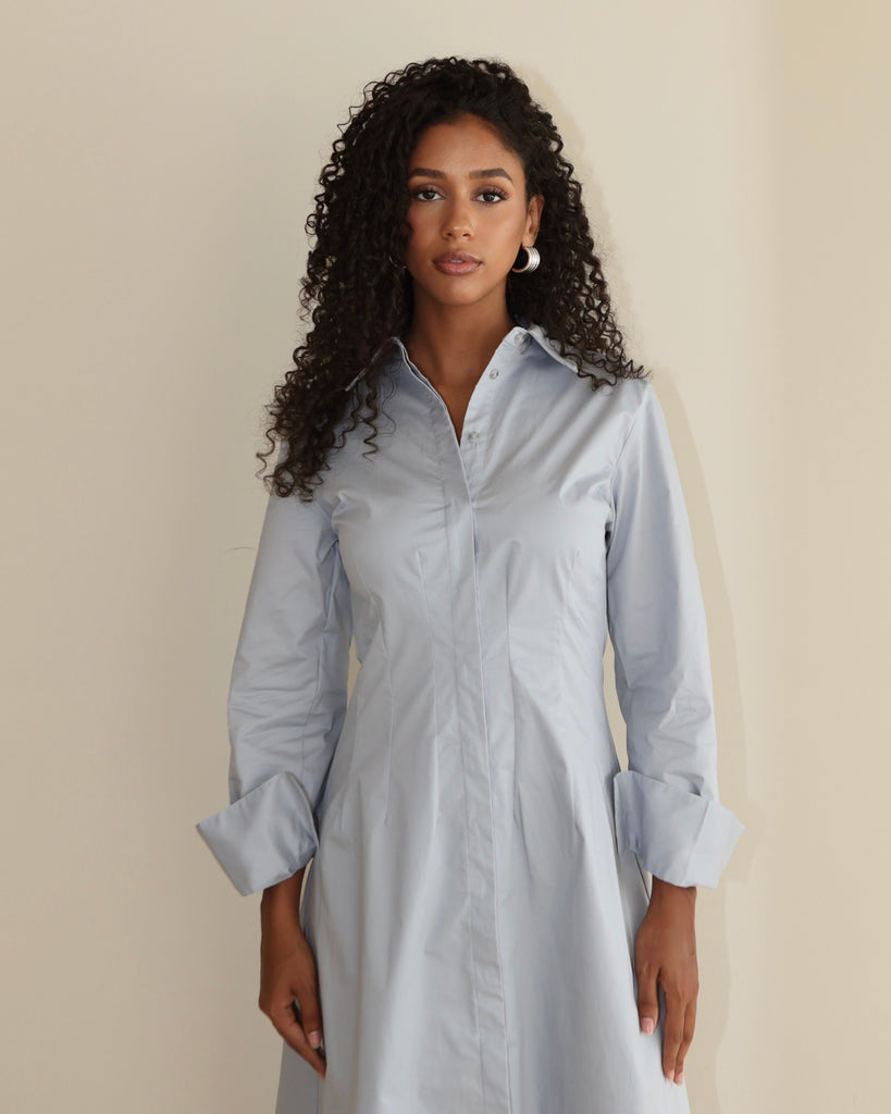 Known by our flattering silhouettes and luxe fabrics, Mira designs epitomise timeless style. The Shirtdress embodies a classic A-line silhouette crafted with structured cotton. Drawing its attention on the structured waist detail and exceptional finish.