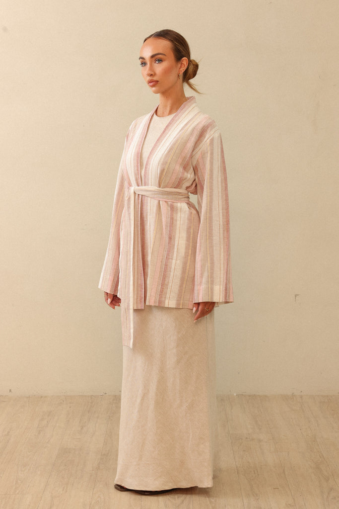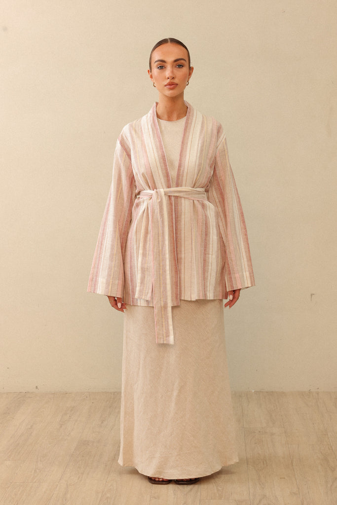 Miras ‘Sicily Stripe kimono’  is minimally designed with our classic and loved kimono fit, featuring belt loops and seperate belt. Made with a lightweight 100% linen fabric, this multi-wear wardrobe staple works layered on pants, skirts and dresses.